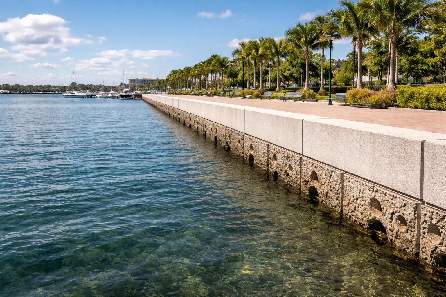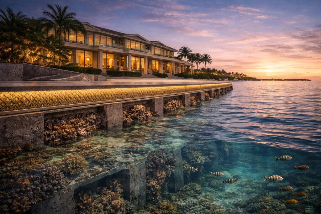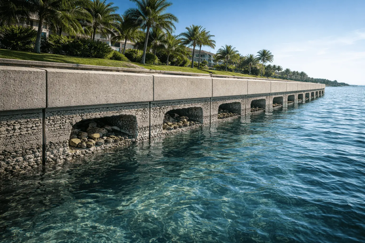 Pure Coastline designs and manufactures integrated seawall systems that protect waterfront communities while restoring ecological function through embedded reef geometry, fish habitat, and coral-support structures.