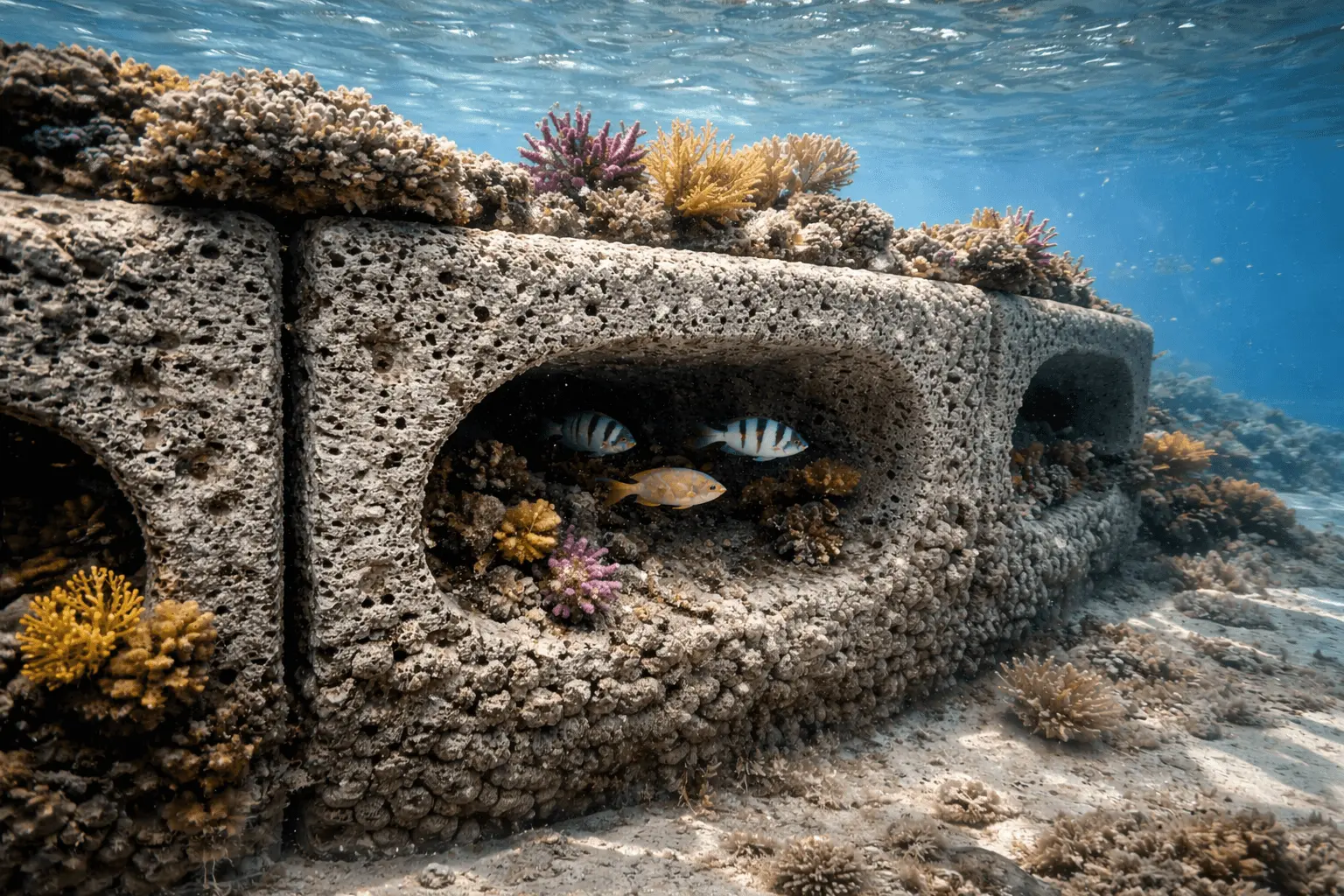 Using AI-driven ecological modeling and advanced concrete 3D fabrication, each reef is engineered to create natural hydrodynamics, light exposure, and habitat diversity.